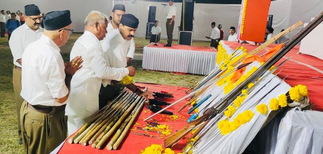 मुख्य वक्ता विभाग प्रचारक विकास राज ने कहा कि शक्ति एवं भक्ति का पर्व नवरात्र में आराधना के बाद देशभर में विजयादशमी उत्सव मनाया गया। संघ विगत १०० वर्ष सनातनी समाज को एक कराने के प्रयास में जुटा हुआ है। भगवान राम ने भी रावण पर विजय प्राप्त करने के लिए गिरीवासी, वनवासी, केवट, निषाद, माता शबरी, हनुमान का साथ लिया। उन्होंने बताया कि हम शास्त्र पूजन तो करते हैं लेकिन शस्त्रों को भूला बैठे हैं। हिन्दूओं के सभी देवी एवं देवता अस्त्र एवं शस्त्र के साथ दिखाई देते हैं। हमे भी हमेशा शस्त्र पूजन करना चाहिए। विकास राज ने बताया कि देशभर में दैनिक शाखाएं, साप्ताहिक शाखाएं और मासिक शाखाएं संचालित हो रही है। इन शाखाओं में बच्चों को संस्कारित करने के प्रयास में जुटे हुए हैं।